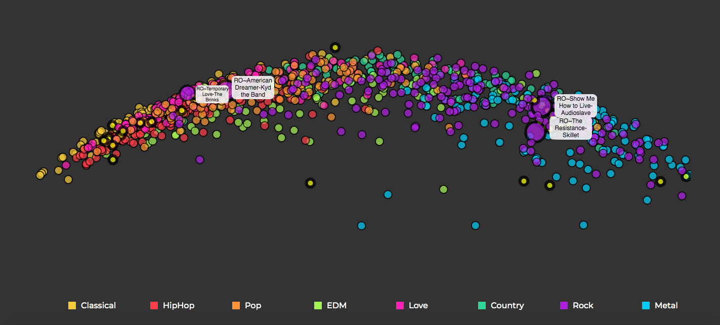 All the songs above belong to the same rock playlist from Spotify but you can see how differently they are arranged on the latent vector space. Temporary love and American Dreamer are on the left closer to the pop cluster while Show me how to live and The Resistance are on the right towards the metallic end. An auditory analysis is sufficient to understand that the model is correct in modelling such behavior. A simple genre based classifier may have incorrectly recommended these songs together but as the VAE model is detecting low level patterns directly from the audio wave without any bias it is able to successfully detect such nuances.